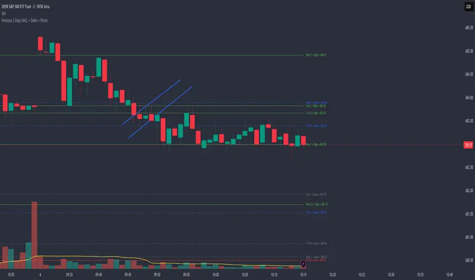 This indicator automatically plots the Open, High, Low, and Close (OHLC) levels for the previous 5 trading days. Unlike standard daily separators, this tool extends the lines from their historical origin all the way to the current price bar, allowing traders to instantly see how current price action interacts with recent support and resistance levels.