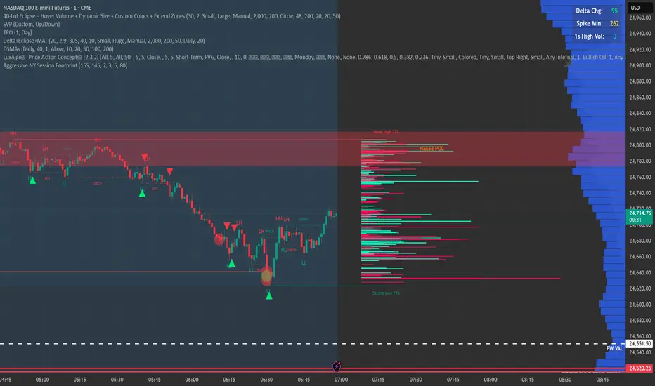 1-Minute Precision: This script is optimized for the 1-minute chart. It uses high-resolution "lower timeframe" data (e.g., 15-second ticks) to ensure the delta calculation is as accurate as a professional TPO footprint.