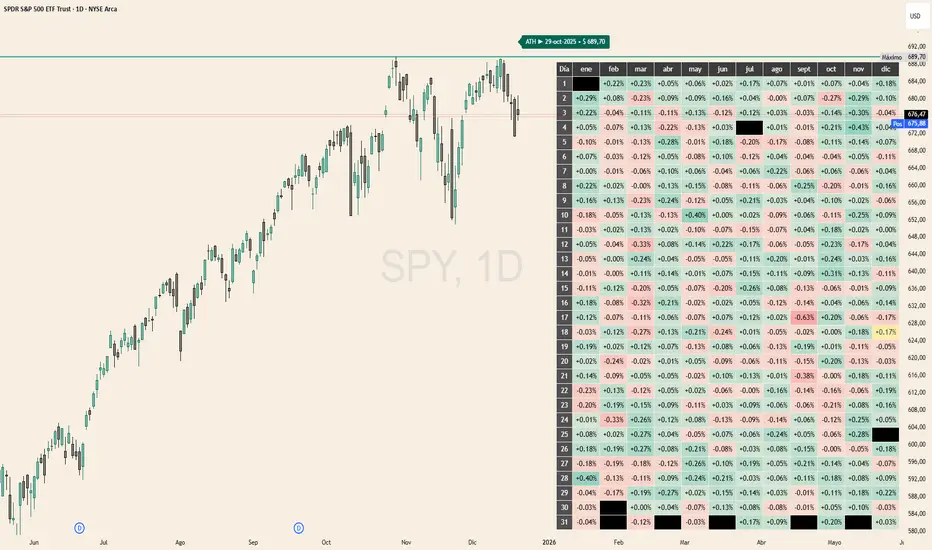 This indicator builds a Day × Month table where each cell displays the historical average of: