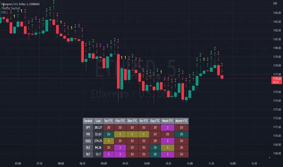 The indicator will allow you to daily enter up to 5 watchlist tickers and in as close to real time (slight lag) show the developing FTFC of your watchlist tickers and avoids having to switch chart tickers to see the developing timeframe continuity