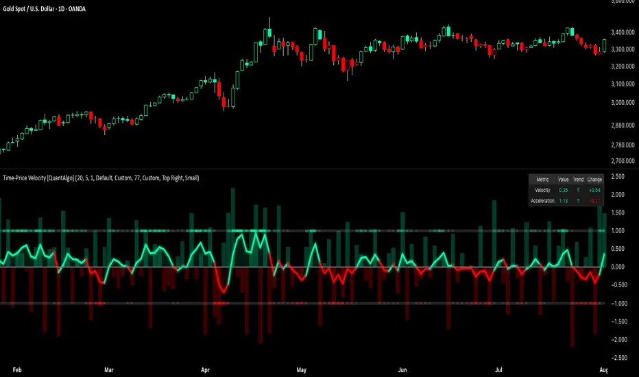The Time-Price Velocity indicator uses advanced velocity-based analysis to measure the rate of price change normalized against typical market movement, creating a dynamic momentum oscillator that identifies market acceleration patterns and momentum shifts. Unlike traditional momentum indicators that focus solely on price change magnitude, this indicator incorporates time-weighted displacement calculations and ATR normalization to create a sophisticated velocity measurement system that adapts to varying market volatility conditions.