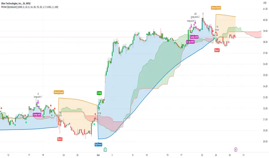 PRISM can exist in either an uptrend or downtrend state, but it does not necessarily imply that it reflects the true trend being observed. Instead, it emphasizes capturing significant movements and capitalizing on them by utilizing oscillator levels and exit points calculated based on oversold or overbought values, along with the volatility associated with these movements.