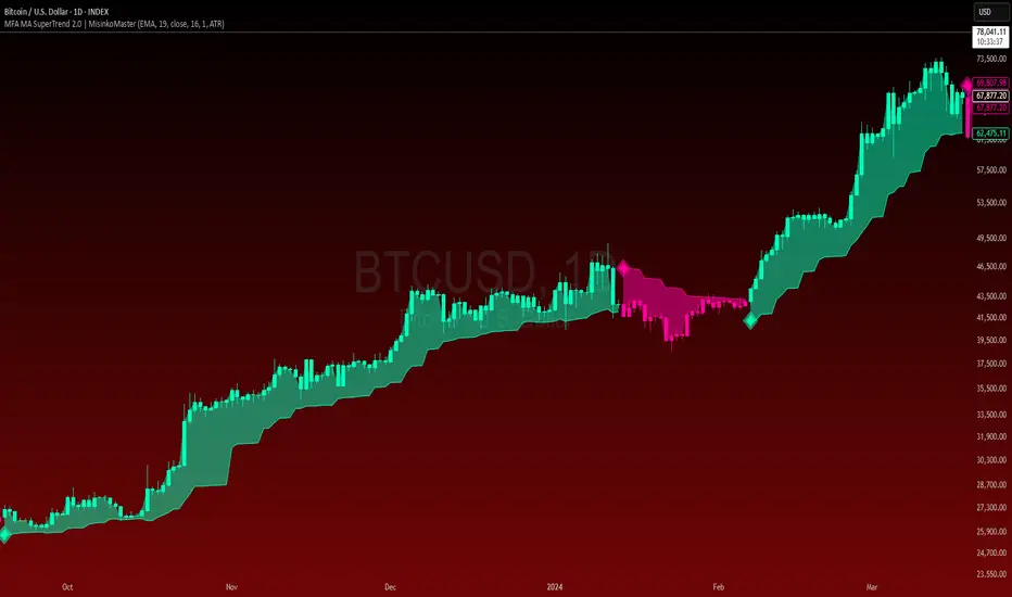 Multiple Factor Adaptive MA SuperTrend is an enhanced trend-following overlay that builds on the classical SuperTrend concept by introducing an adaptive moving-average base. The indicator dynamically adjusts to changing market conditions to produce smoother and faster trend signals, helping traders better track directional moves while reducing unnecessary noise.