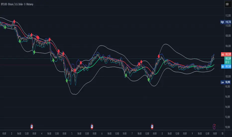 The visual representation enhances signal clarity. The MAIN TMA centerline changes color dynamically based on its slope, displaying green during upward movement and red during downward movement. This gives you instant visual confirmation of the prevailing trend direction. The signal markers themselves appear as diamond shapes positioned just outside the MAIN channel bands, with cyan diamonds indicating buy opportunities below the lower band and blue diamonds marking sell opportunities above the upper band. You could consider taking bull signals only on long trend, and vice versa for the sell signals.