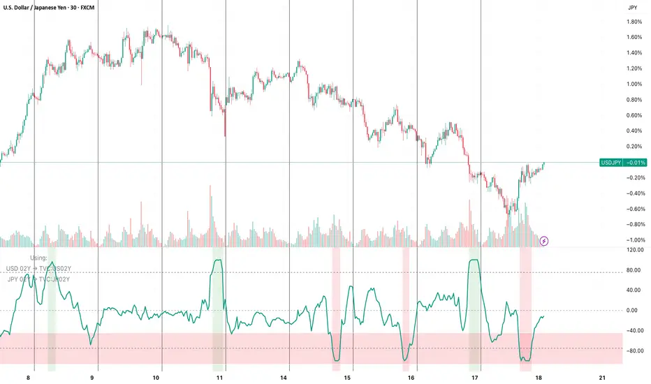 - Above +75 / below −75: FX price has deviated sharply from yield-spread behavior—potential exhaustion or continuation zone.