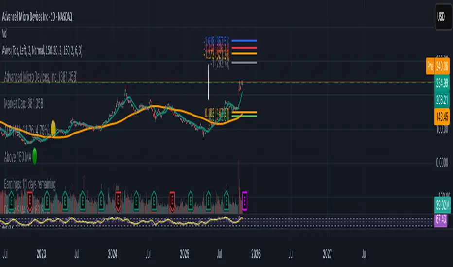 It shows company info, symbol, industry, market cap, ATR(14) with color status, earnings countdown, and distances from the current price to SMA150 and the all-time high.
