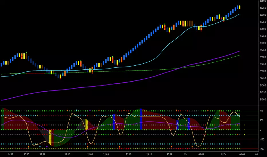 I moved the chopzone to 150, imo, chopzone sitting close to sidewinder gives easier feedback to read, also, if you notice, other than the base line's color code, i have two lines that are similar to eachother, these are showing the relative positions of turbo, cci, and regression with eachother, three circles at the right side show turbo, cci, and regression's positions relative to the horizontal zones. In other words, when things get really close to eachother, no more guessing needed. one more thing that I may add to this tommorrow is to put signalling signs on the lines when they cross to help identifying the crosses and the color would code you toward possible positions in "MY" system.