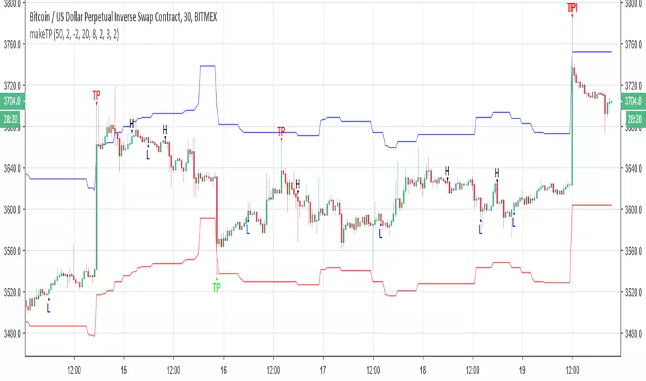 the model is based on the early model that I put in last publication , the problem is that the fire point of the buy and sell has a delay and shoot some bars after (its not repaint but a bug due to TV code) . but once it stay it will calculate correctly the take profits . so I add take profit 1 and take profit 2 to the script . and since take profit 1 is correct without delay I add option to use it as buy again or short again . you can the older entry point which is H= high or L =low as your initial buy point but be aware that it sometime shoot too late since the problem in TV script to transfer the price correctly .or to enter to buy again option which is based on take profit 1 . the H and L are correctly detecting most of the time the Highs and the lows so by going on the trend them you can use the TP which are by % to max out your gains .. this is the theory behind this model