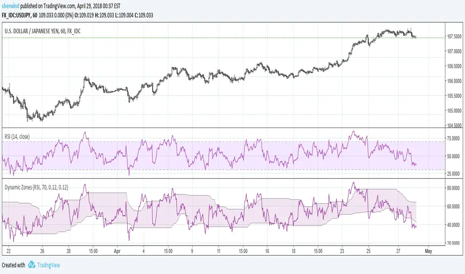Dynamic Zones is meant to be applied to oscillators to get dynamic overbought and oversold levels