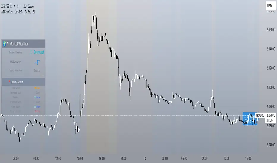 AI Market Weather Forecast Pro is an innovative multi-timeframe trading system that uses global meteorological metaphors to visualize market conditions. By analyzing dimensional latitude regions, it transforms complex market data into intuitive global weather forecasts and temperature readings, helping traders quickly assess market sentiment and trend strength.