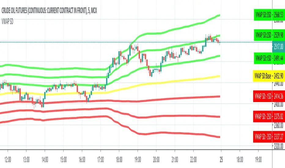 VWAP Standard Deviation Multi-Time Frame indicator shows VWAP , 1 standard deviation price from the VWAP, 2 standard deviation price from the VWAP and 3 standard deviation price from the VWAP