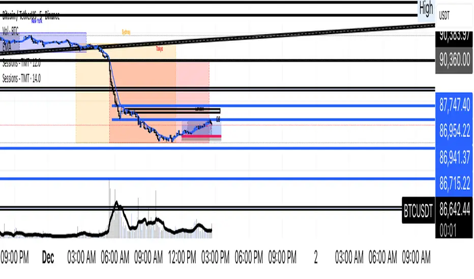 This indicator highlights four configurable trading sessions (default: New York / London / Tokyo / Sydney) and draws session ranges, session VWAPs, session mean/trendline, max/min lines and optional dashboard info. It was built for students of Thought Magic Trading (TMT) to quickly visualize intraday structure across major sessions.