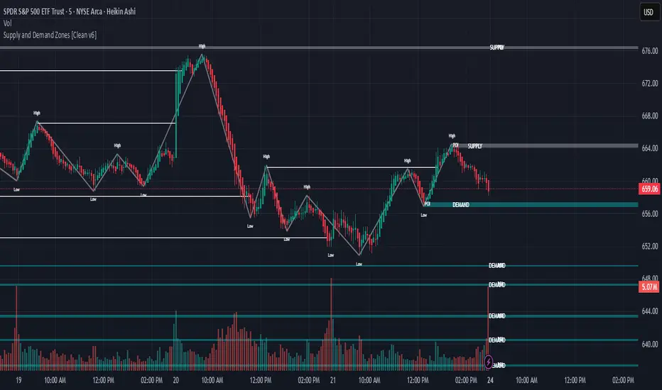 The Supply and Demand Zones [Clean v6] indicator is an automated market structure tool designed to identify high-probability Points of Interest (POI) on any asset or timeframe. Built using Pine Script v6, this script focuses on clarity and performance, providing traders with a clutter-free view of where institutional buying and selling pressure has previously occurred.