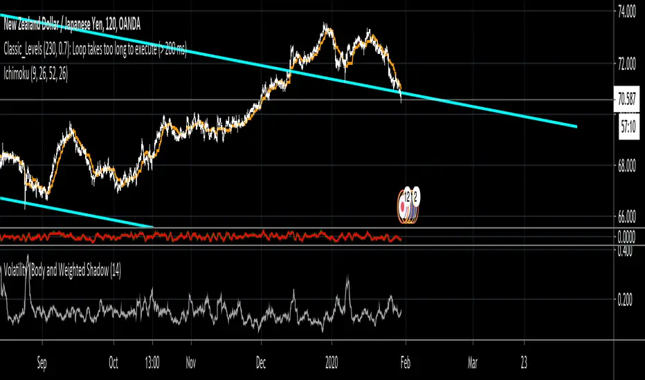- This indicator averages the bodies of candlesticks over a default length of 14 periods. It also considers the length of shadows via a weighted average. This is done as it is assumed that financial institutions tend to move price to levels that do not hold (shadows). Therefore, wick lengths are less significant than the candlestick bodies, so they are weighted to hold less value.