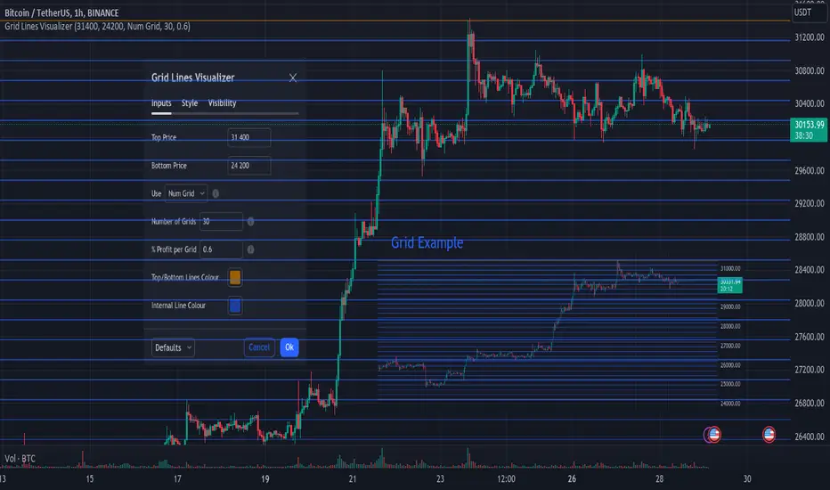 Determine Grid Parameters: Choose either the number of grids or profit per grid, depending on your preference and trading strategy. If you select the number of grids, the script will evenly distribute the gridlines within the specified price range. Alternatively, if you opt for profit per grid, the script will calculate the price increment required to achieve your desired profit level per grid.