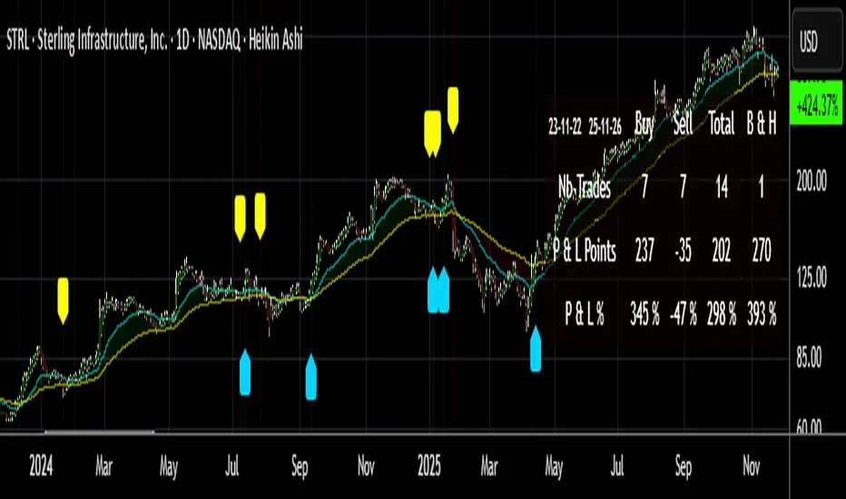 . A Table shows the effectiveness of the signals on the current visible chart, providing immediate, realistic feedback. The Buy & Hold strategy results are also included for comparison with the Buy/Sell swing strategy. The Buy & Hold results start from the first Buy signal to ensure a fair comparison.