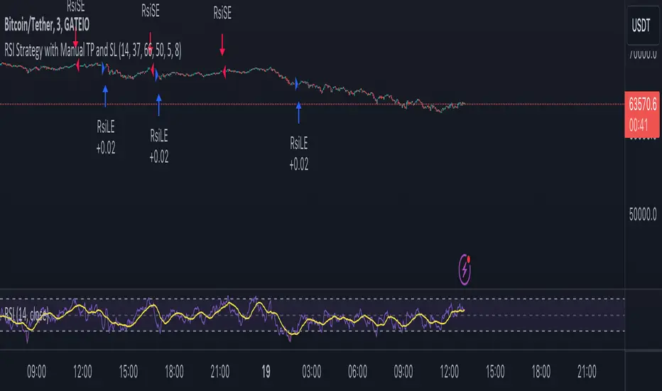 This TradingView script implements a simple RSI (Relative Strength Index) strategy with manual take profit (TP) and stop-loss (SL) levels. Let's break down the script and analyze its components: