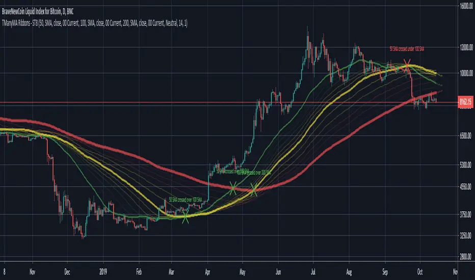 - Crossovers are plotted on the chart with detailed information regarding the crossover (Ex: 50 SMA crossed over 200 SMA )