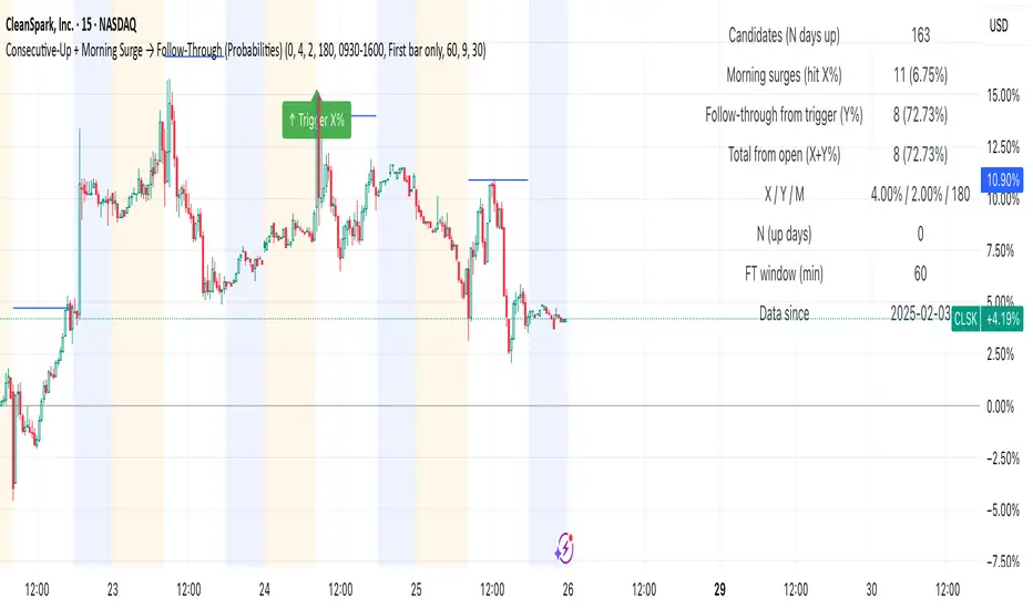 • Customizable thresholds for premarket/open surge (%) and follow-through window (minutes).