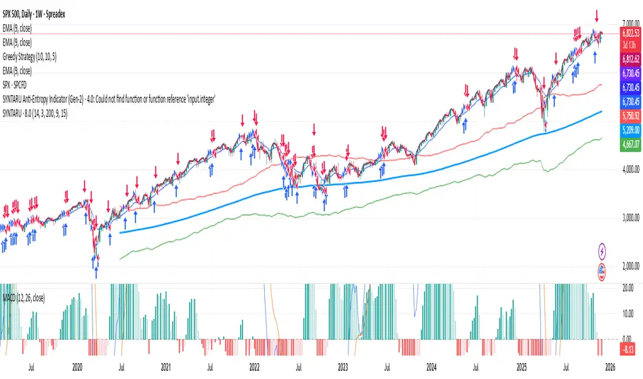 This is the official signal generator for the $\mathbf{SYNTARU}$ automated trading system. It is engineered based on the principle of Anti-Entropy—meaning it seeks out market structure (Coherence) and avoids chaotic price action.Core Function (Chaos vs. Coherence):The indicator's sole purpose is to measure the current state of the market against a rigorous set of constraints to generate only high-probability entry signals.Tesla 369 Axiom ($\mathbf{G2}$): Uses a Volatility Multiplier of 3.0 to define the boundaries of market Chaos (the "danger zone"). The system only acts when the price has been pushed outside these safe bounds.Trend Coherence Filter ($\mathbf{G1}$): Ensures that signals are only taken when the long-term trend (200-period EMA) is strong and clearly defined, filtering out flat, high-risk "whipsaw" markets.The Signal: When all filters align, the indicator plots a BUY or SELL signal, which is transmitted via a Webhook (such as the one used at syntrekgeo.world/syntaru_listener.php) to an external execution framework.This indicator does not manage risk, position size, or exits (which are handled by the external execution code using the Flip Compounding method and the 1:3 RRR mandate). Its only mission is to ensure the integrity of the ENTRY SIGNAL.