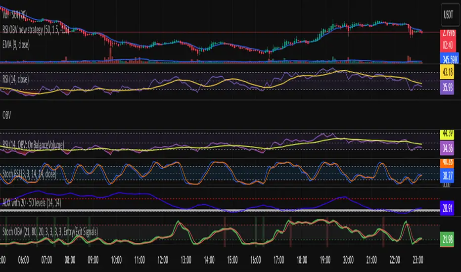This indicator combines a classic price-based Stochastic Oscillator with a Stochastic Oscillator applied to OBV (On-Balance Volume) in a single panel, giving traders a clear view of both price momentum and trading volume strength on a normalized 0–100 scale.