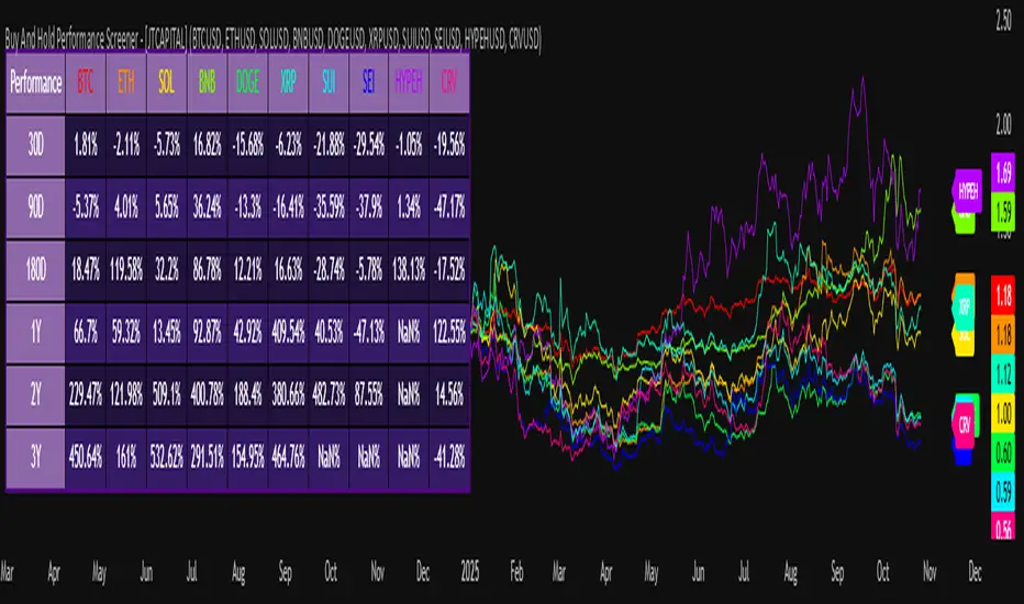 Buy And Hold Performance Screener – [JTCAPITAL] is a script designed to track and display multi-asset “buy and hold” performance curves and performance statistics over defined timeframes for selected symbols. It doesn’t attempt to time entries or exits; rather, it shows what would happen if one simply bought the asset at the defined start date and held it.