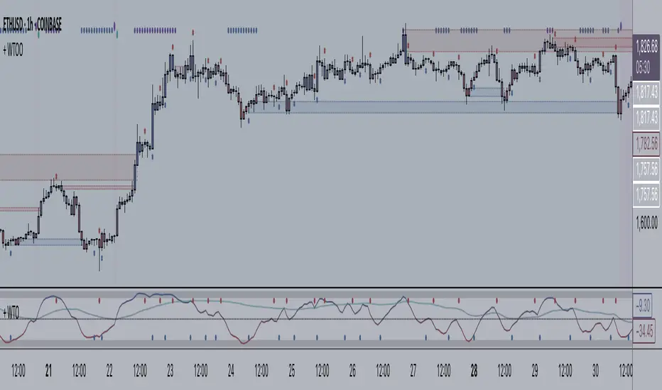 Also, symbols are printed above and below candles for when the moving average of the primary WTO is crossed.