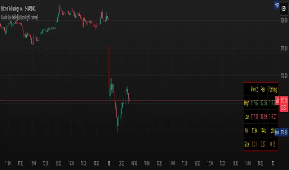 This intraday trading tool displays the High, Low, Volume, and Size (range) of the last 3 candles on your chart, providing a quick and clear reference for short-term momentum, volatility, and potential trade decisions.