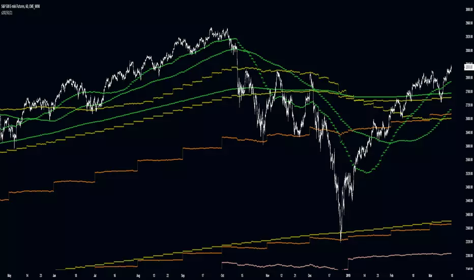 These multi-timeframe 21, 50 and 200 period sma use an improved calculation to accurately calculate the indicator's value with every new bar on the time frame your chart is set to. Previously the indicator only recalculated with every new update on the timeframe used in its security function. This means that this improved script plots the real, current value of your indicator across your chosen timeframes on your chart's resolution and no longer only plots only the indicator's monthly/weekly/daily/4 hour/ect closing value on the your chart.