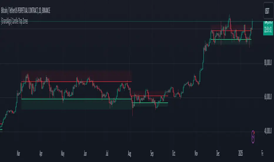 The Candle Trap Zones indicator evaluates historical price data to identify ranges where price has been trapped. Zones are filtered using proximity detection to prevent overlaps and maintain clarity. Additionally: