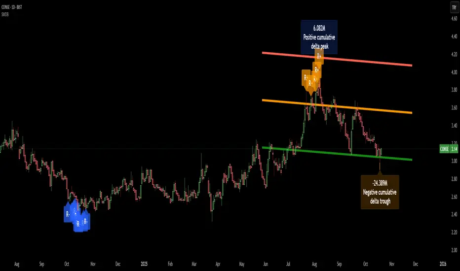 From this feed, the indicator accumulates delta over a configurable period (default: 100 bars). When cumulative delta reaches a local maximum or minimum, peak and trough markers appear, showing the precise bar where buying or selling pressure statistically peaked.