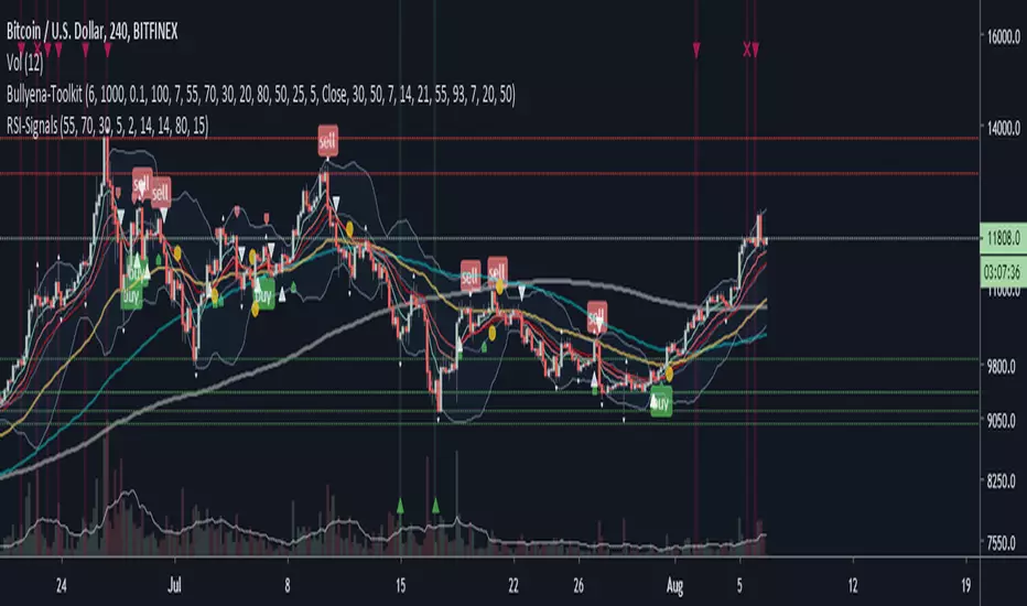 Shows buy/sell signal when RSI crosses above median levels. Default at 55.