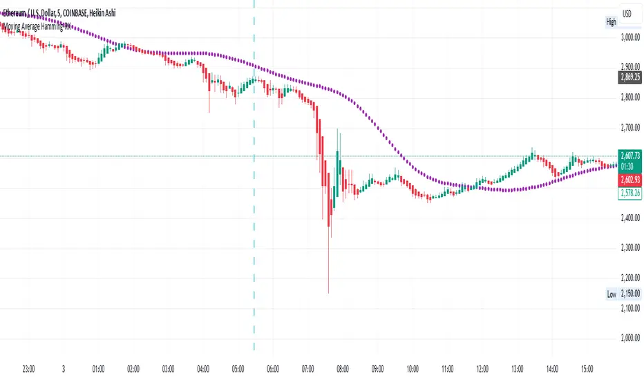 Sell Signal: When the price crosses below the Hamming Moving Average, signaling a possible downtrend.