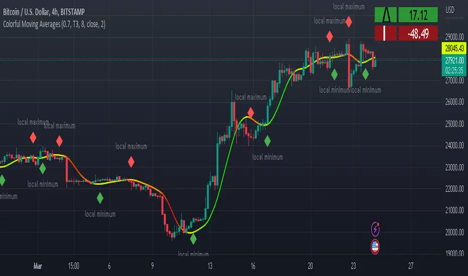 it paints the selected moving average type according to the momentum it has, and also shows the momentum and acceleration values in a table. colors are interpreted as follows: the color of the moving average is red, the momentum is negative; A green color means the momentum is positive, and a yellow color means the momentum is 0. As the momentum changes, the moving average takes on different shades of these 3 colors. how it actually works can be easily understood at a glance.