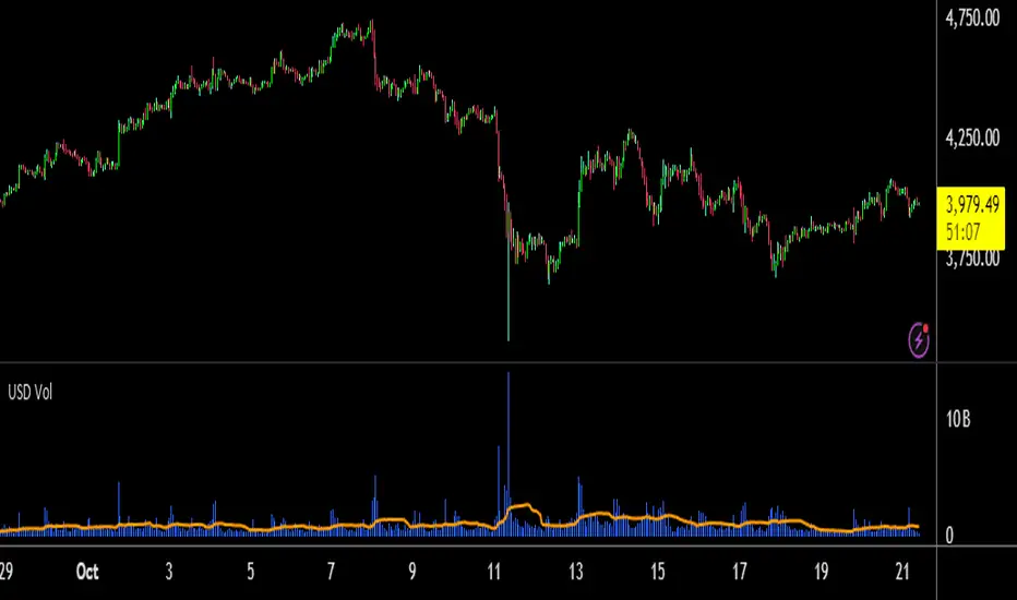 Simple USD volume indicator designed to visualize trading volume in USD terms rather than raw share/contract volume. It's particularly useful for comparing liquidity across assets with different price levels, as it shows the approximate dollar value traded per bar (e.g., candle). The indicator appears in a separate pane below the main chart (non-overlay) and uses a volume-formatted scale for readability.
