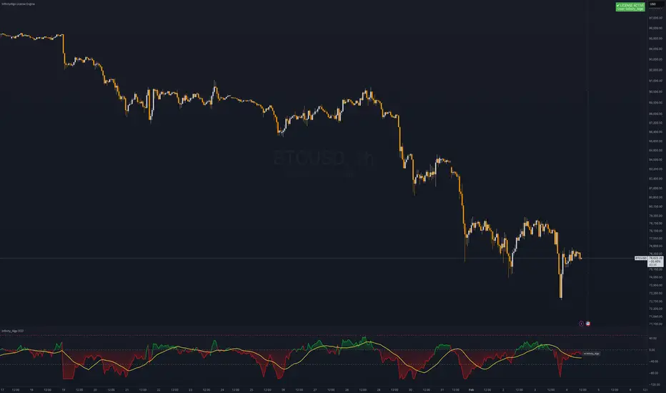 The Infinity_Algo VCO is a volatility-based oscillator designed to identify trend direction, overbought/oversold conditions, and potential divergences. It is plotted in a separate pane and uses price volatility with moving averages.