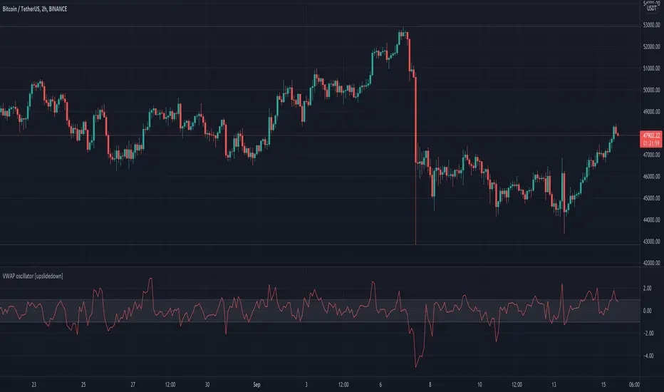 This VWAP oscillator showcases the percent difference between VWAP and current price within an oscillator centered on 0. My thesis for this indicator is that trend following within the threshold zone (defaulted to 1%) would be "choppy" but outside is a significant trend. Another way to think about VWAP is potential for taking profits, as price will always be magnetized back to the center.