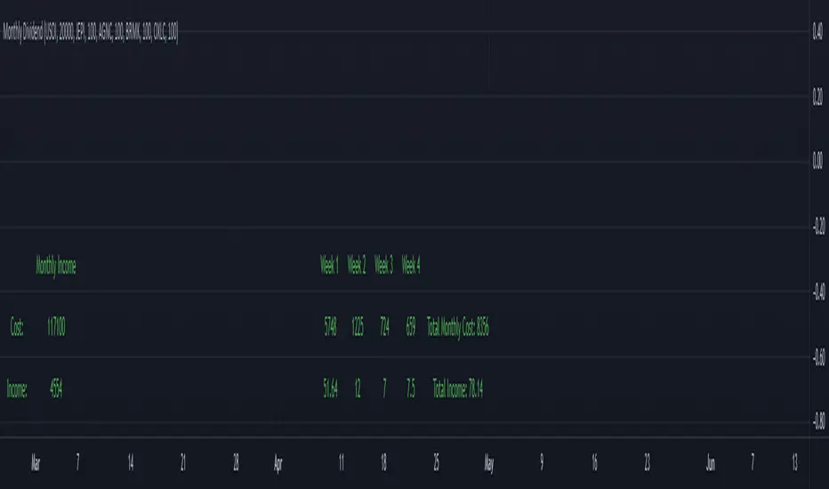 Although I use monthly dividend stocks as an example it would be best to use 4 stocks for each week that pay out quarterly, however trading view doesn't allow that many requests so this is the best I can make...