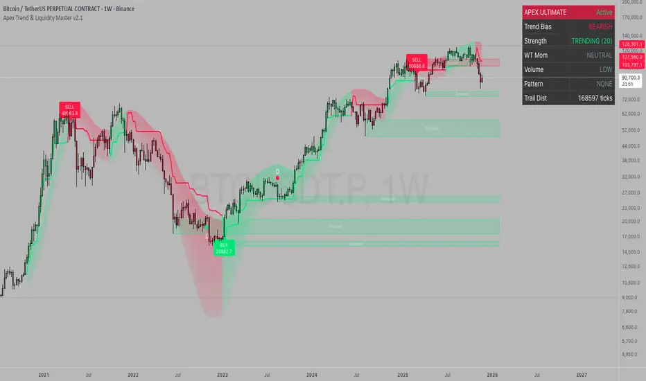 CONCEPT & OVERVIEW The Apex Trend & Liquidity Master v2.1 is a comprehensive trading suite designed to unify Trend Following, Smart Money Concepts (SMC), and Momentum detection into a single, clutter-free interface.