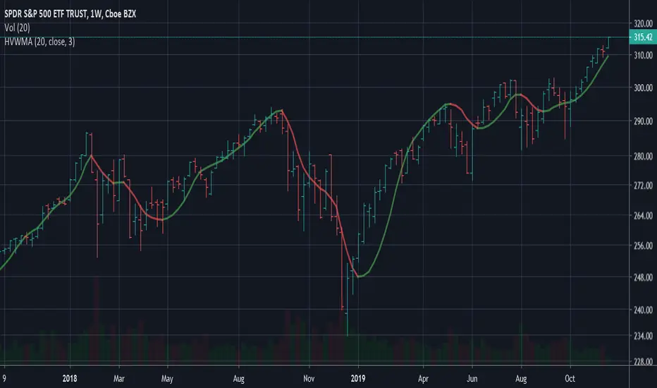 A simple variation on the Hull Moving Average which reacts faster to high volume events, making it more responsive in those cases than even the standard Hull average.