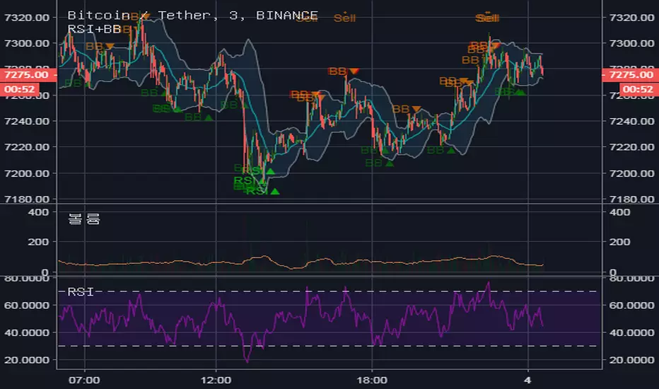 비트코인 10분봉에서 RSI 30 상향 돌파, BB 하단 터치시에,
