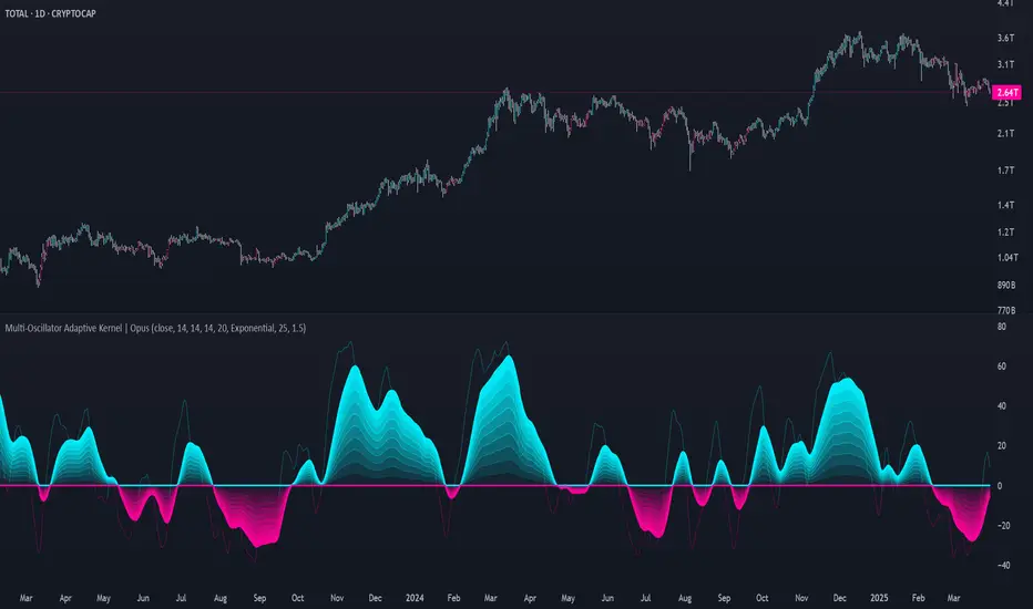 The Multi-Oscillator Adaptive Kernel (MOAK) is an advanced technical analysis tool that combines multiple oscillators through sophisticated kernel-based smoothing algorithms. This indicator is designed to provide clearer trend signals while filtering out market noise, offering traders a comprehensive view of market momentum across multiple timeframes.
