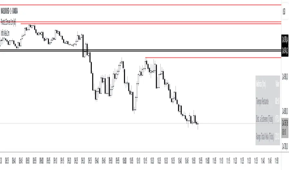 This script is designed for scalpers and day traders who base their entries on low timeframes (like 1m) but reference liquidity levels from higher timeframes (HTF), in this case, 15m.Key Features:HTF Pivots on LTF: It calculates swing highs and swing lows (pivots) from the 15m chart and projects them as horizontal rays onto your 1m chart.Real-Time Mitigation: The rays (representing pending liquidity) are automatically deleted on the 1m candle as soon as the price mitigates (touches or breaks) that level. This allows you to clearly see which levels have already been tested and which have not.Configurable Pivot Strength: Includes an input to define the "Pivot Strength," allowing you to adjust how many candles on each side are needed to confirm a swing point (e.g., a value of 1 creates 3-bar pivots, a value of 2 creates 5-bar pivots, etc.).Info Table: Displays a real-time table with vital information from the current 1m candle:Time remaining until the candle closes.Total range of the candle in ticks.How to Use:This indicator must be loaded exclusively on a 1-minute (1m) chart.Adjust the "Pivot Strength" in the settings according to your strategy (a value of 1 or 2 is recommended).