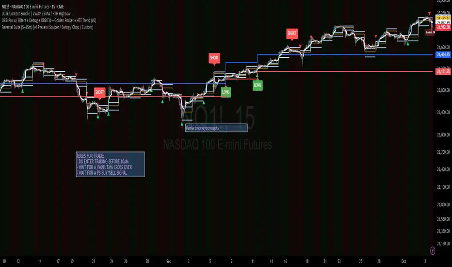 It combines institutional-grade tools — VWAP bands, EMA trend zones, and RTH high/low anchors — to help traders identify momentum shifts, session extremes, and volume-weighted fair value zones in real time.