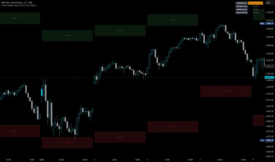 Volatix Range Map LITE provides traders with a simple way to visualize intraday expected high and low zones based on daily volatility. By anchoring to the daily open and scaling ranges with the ATR, the indicator highlights the areas where price is likely to fluctuate during the session.