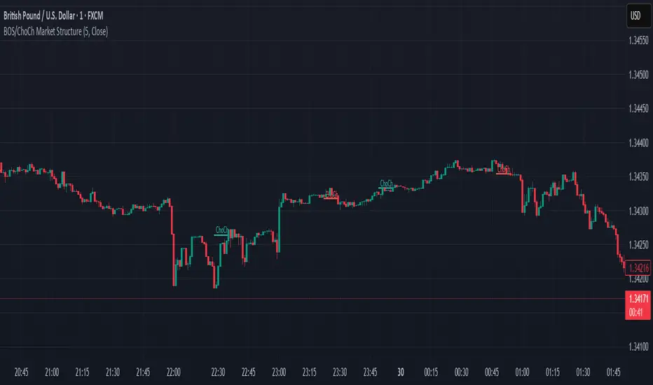 This indicator identifies key market structure shifts using Break of Structure (BOS) and Change of Character (ChoCh) signals based on pivot point analysis.