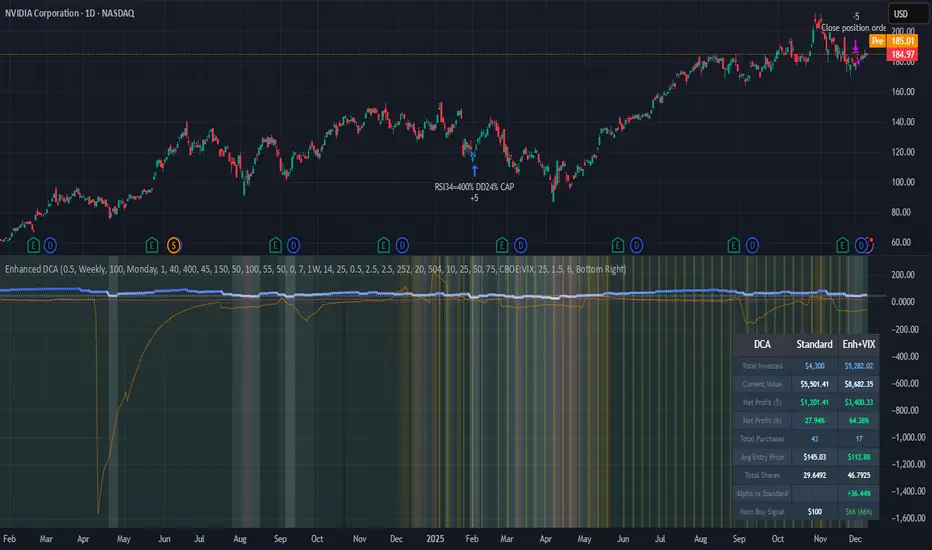 * **Full Comparison:** The script includes a live display panel showing a direct comparison between the Enhanced DCA performance metrics (Net Profit, Average Entry Price, Alpha) and the Standard DCA benchmark.
