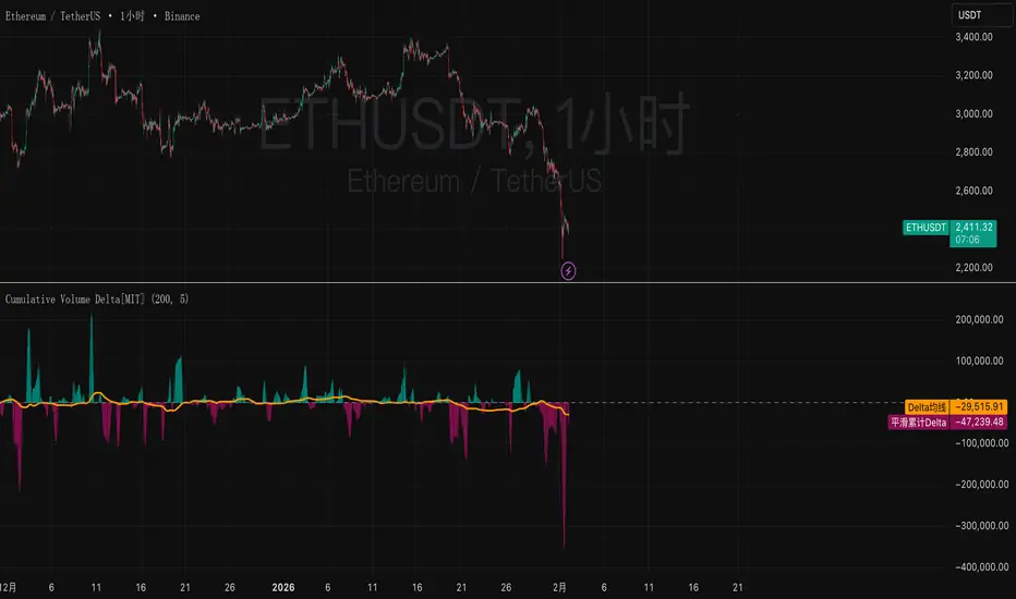 这是一个基于K线形态粗估的累计成交量Delta指标,用于近似判断短期内主动买方与主动卖方的力量对比。