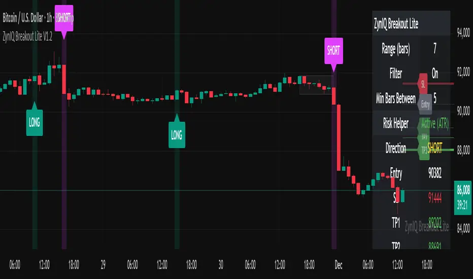 ZynIQ Breakout Lite v1.2 provides a streamlined breakout framework designed to highlight expansion moves from short-term consolidation. It focuses on clarity and simplicity, making it suitable for intraday and swing trading.
