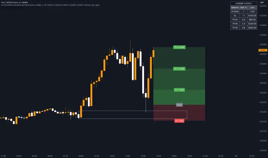 this indicator is designed to simplify and optimize risk management. It automatically calculates the ideal lot size based on your account balance, risk percentage, and defined entry and exit levels. Additionally, it includes visual tools to represent stop-loss (SL) and take-profit (TP) levels, helping you trade with precision and consistency.